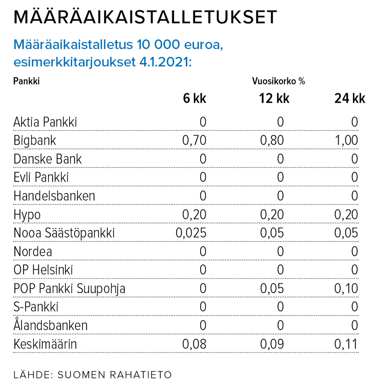 Taloustaidon vertailun pankeista vain neljä maksaa korkoa määräaikaistalletukselle, kun talletettavana on 10 000 euron summa 12 tai 24 kuukaudeksi. Kuuden kuukauden talletukselle saa tammikuussa korkoa kolmesta pankista. Useimmissa pankeissa määräaikaistalletuksille ei makseta lainkaan korkoa.