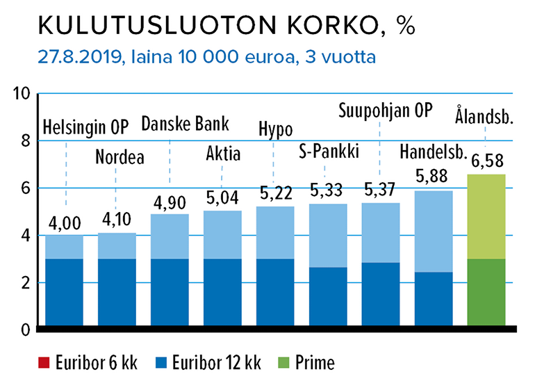 Elokuun lopussa edullisin vakuudellinen 10 000 euron kulutusluotto irtosi Helsingin OP:stä, josta lainan sai 4,00 prosentin korolla. Kallein oli Ålandsbankenin tarjous (viitekorko prime).
