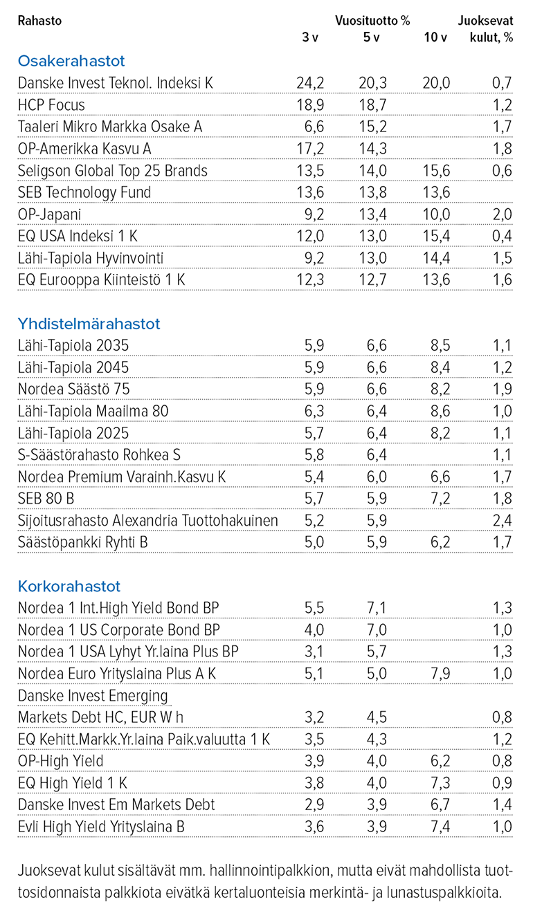 Taloustaidon vertailusta selviää, mitä osakerahastojen, yhdistelmärahastojen ja korkorahastojen tuotoille on tapahtunut keskimäärin kolmessa, viidessä ja kymmenessä vuodessa.