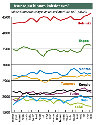 Muualla maassa keskimääräinen hintataso jatkaa hiljalleen valumistaan ja alkaa jo lähestyä vuoden 2010 tasoa. Alueellinen vaihtelu on kuitenkin suurta.