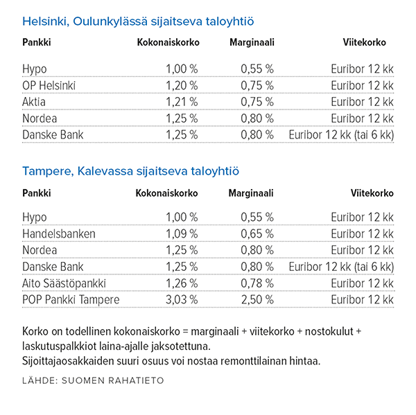 Helsinkiläinen taloyhtiö pyysi tarjoukset viideltä pankilta kesäkuussa 2022. Tampereella tarjous saatiin kuudesta pankista.